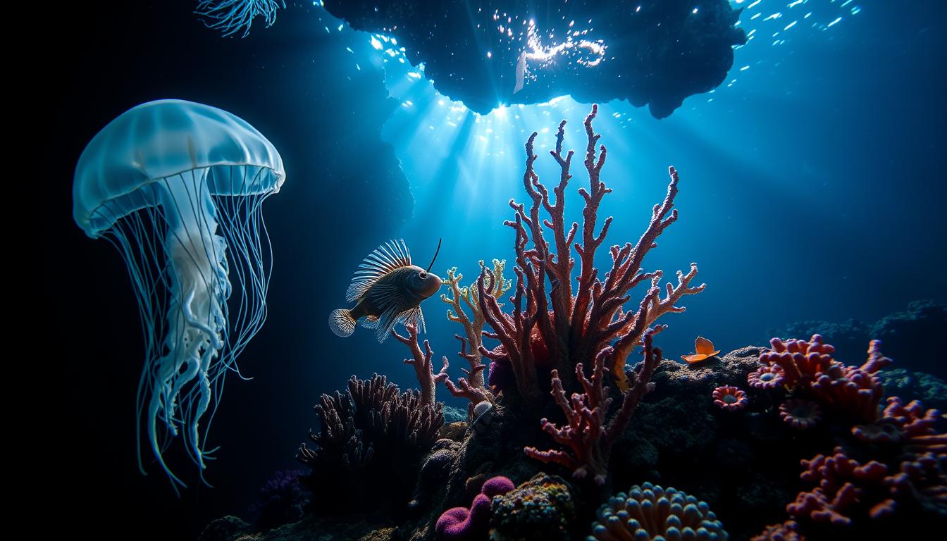 As we explore the deep, we find a world full of life. These deep-sea creatures have special ways to live in the dark and high pressure. They teach us about life’s limits and the natural world’s strength. Let’s discover the secrets of the marine life that lives in the deep sea.