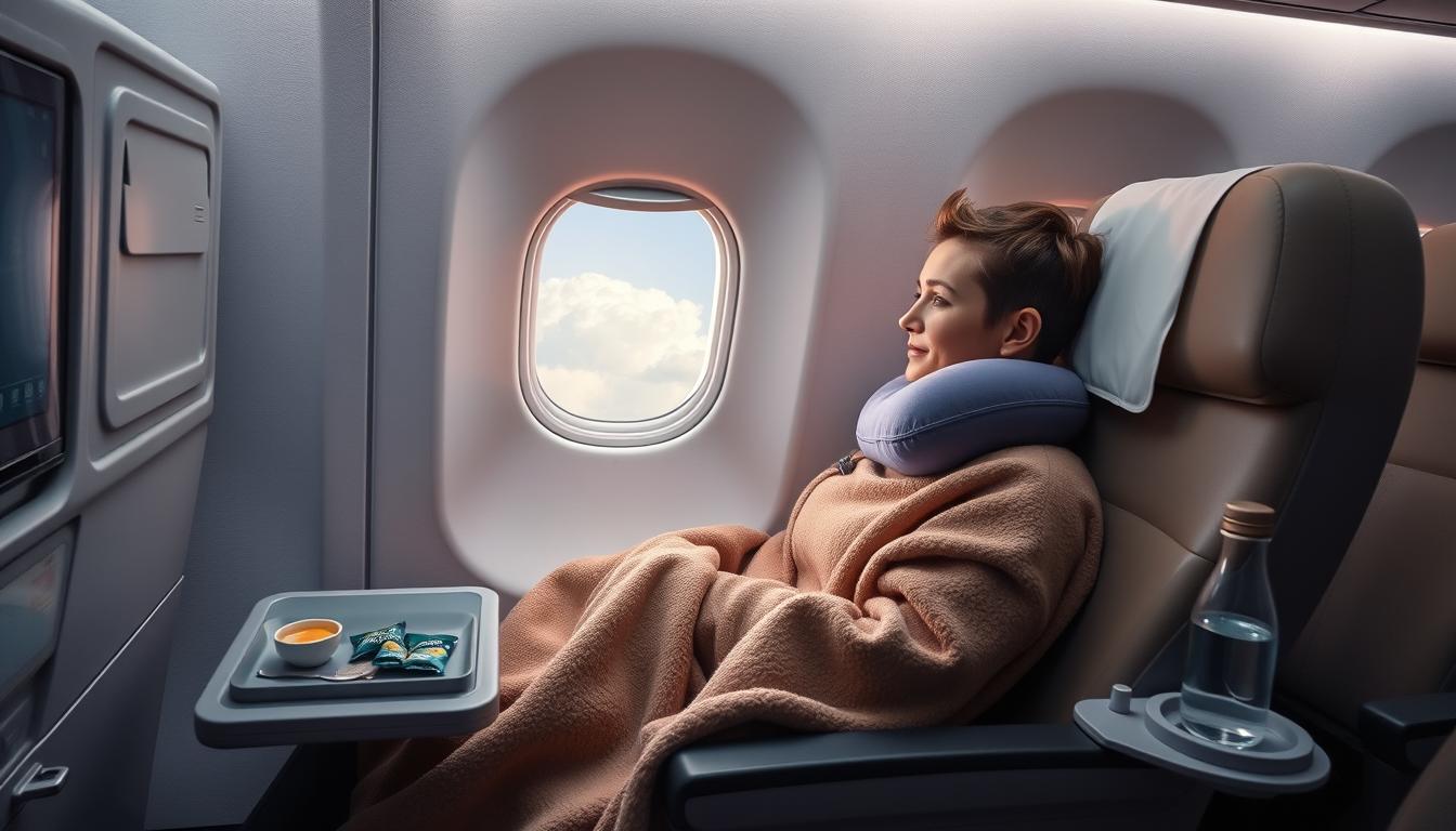 To make your flight more relaxing, think about using noise-cancelling headphones or earplugs to block out noise. A travel pillow or small blanket can also help you get comfy and rest well during the flight.